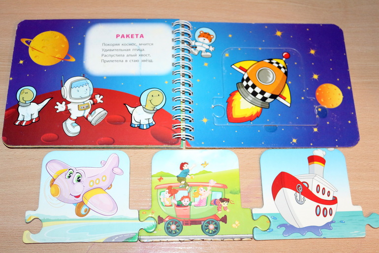 В книжке 4 маленьких четверостишия про самолет, поезд, корабль и ракету.