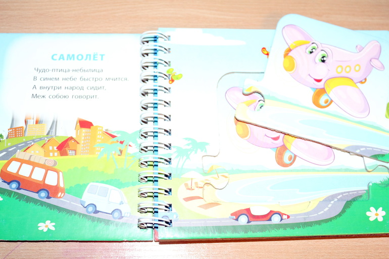 В книге пять разворотов, на каждом из которых пазл, состоящий из 6 картинок.