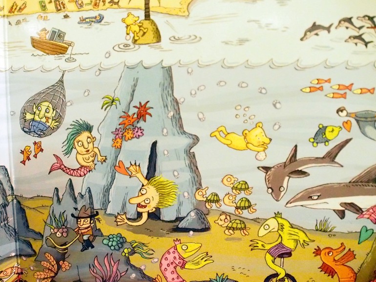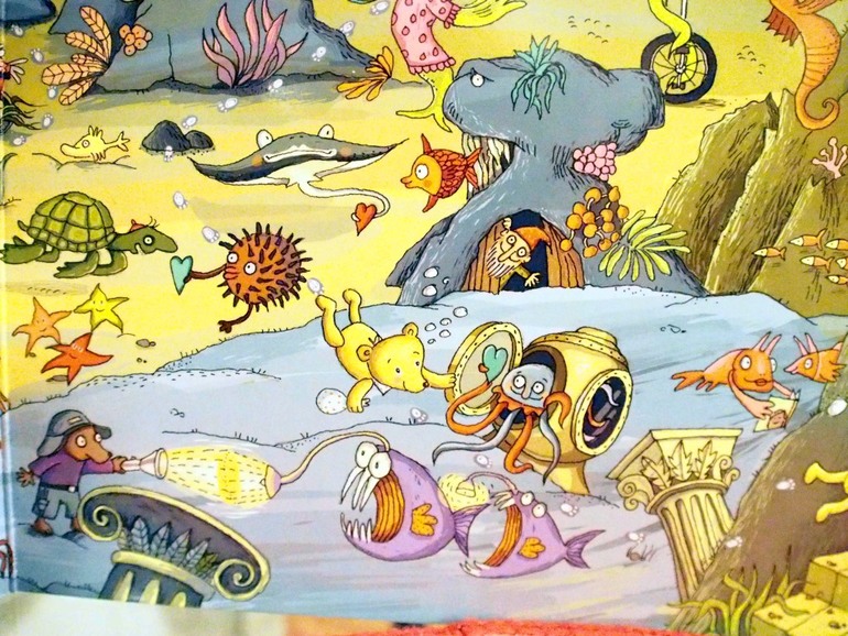 Следующий друг - осьминог, и глубоководное погружение в пучину морских тайн: сундуки с сокровищами, затонувшие корабли, остатки Атлантиды и невиданные морские обитатели. Русалки с обнаженной грудью (мамам, по просьбам которых, Антон Ломаев перерисовывал грудь Русалочки, этот виммельбух лучше в руки не давать…)