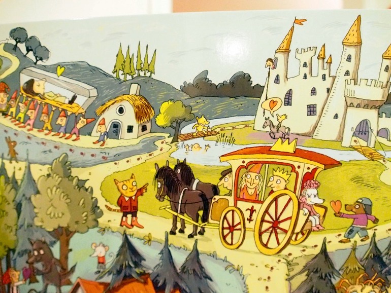 А мишка, тем временем, уже оставляет следы своих лап на следующей странице. В лесу, где живет его приятель гном, а также разбойники, и заколдованные деревья, и пещера с человеческим лицом, и, сдается мне, Людовиг Четырнадцатый, и знаменитый Кротик, и… Как видите, поводов задержаться на этом развороте тоже не мало.