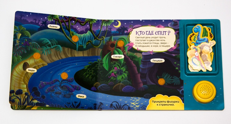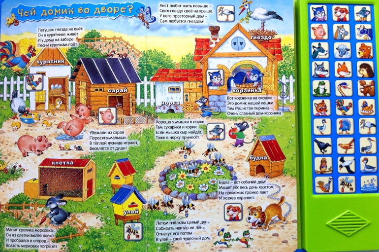 Справа находится звуковой блок, куда нужно вставлять звуковые карты. Каждой странице соответствует определенная карта. На этой карте нужно жать на картинку животного, голос которого хочешь услышать.