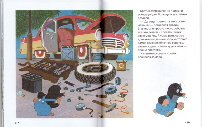 А вот следующая история "Кротик и автомобильчик" - наоборот - зачитанная) Потому что машинки мы любим очень, и картинок в книге очень много с машинками - развороты очень хороши! Собственно из-за этой истории мой мальчишка так любит эту книгу)