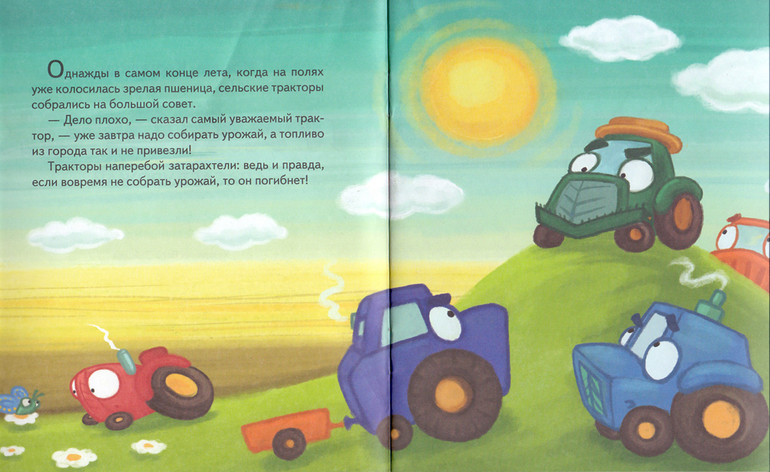 Симпатичные забавные, местами познавательные, картинки о жизни разных героев-машинок. Потом перед сном малыш просит рассказать продолжение этих историй - и придумываю и рассказываю какие-нибудь простенькие рассказы, в которых главные герои - Тракторок, Катерок, Паровозик и Самолётик