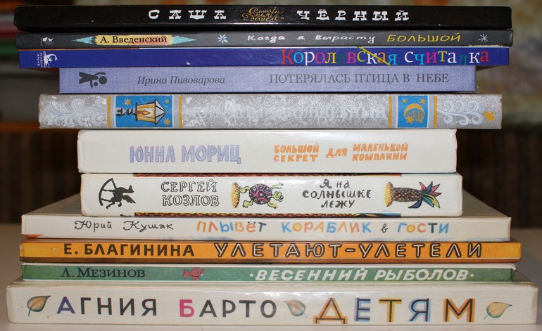И закружилась карусель: Берестов, Сапгир, Заходер, Пивоварова, Барто, Токмакова, Александрова, Благинина, Мориц, Левин, Лунин, Муха, Серова, Маршак, Михалков, Хармс, Демьянов, Сеф, Аким, Кушак, Милн, Мошковская, Дядина, Карганова, Бородицкая… Где-то всего несколько любимых стихотворений, где-то книжка или сборник почти целиком.