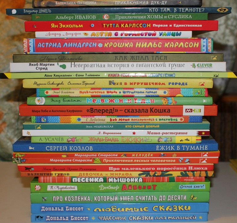 Больше всего из стопки досталось книгам «Жили-были ежики», «Невероятная история о гигантской груше», «Книга невероятных изобретений», «Буратино», «Доктор Айболит», «Девочка и жирафа» и «Лотта с Горластой улице».