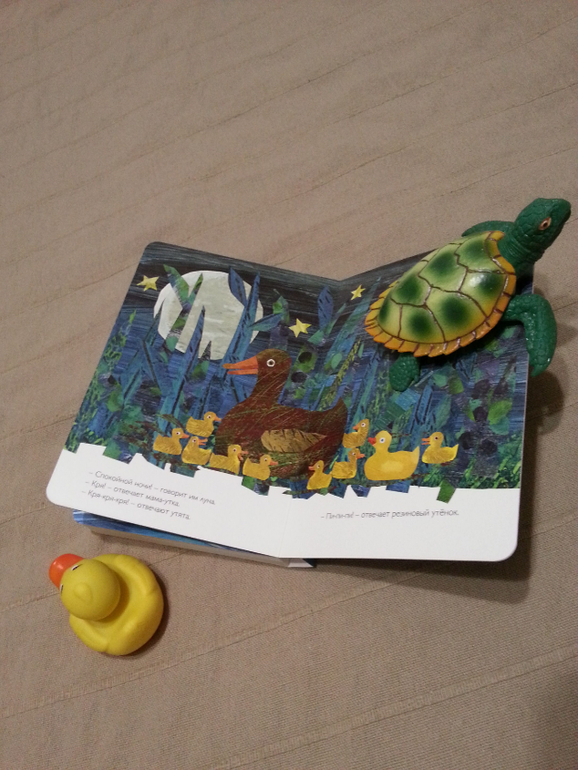 Сегодня к нам приехал наш "букашечный" заказ. О заказе в целом, состоянии книг и упаковке будет отдельная "песня", а пока несколько разворотов новинки от "Розового жирафа". Подробный отзыв напишу завтра, когда можно будет сфотографировать развороты при дневном свете. Пока скажу только, что качество как всегда на высоте, ребенок доволен, а вот к самому содержанию лично у меня есть некоторые вопросы. Например автор дает толчек к изучению сторон света, но есть так же слово "наискосок", а на картинке утенок при этом все так же плывет почему-то направо.