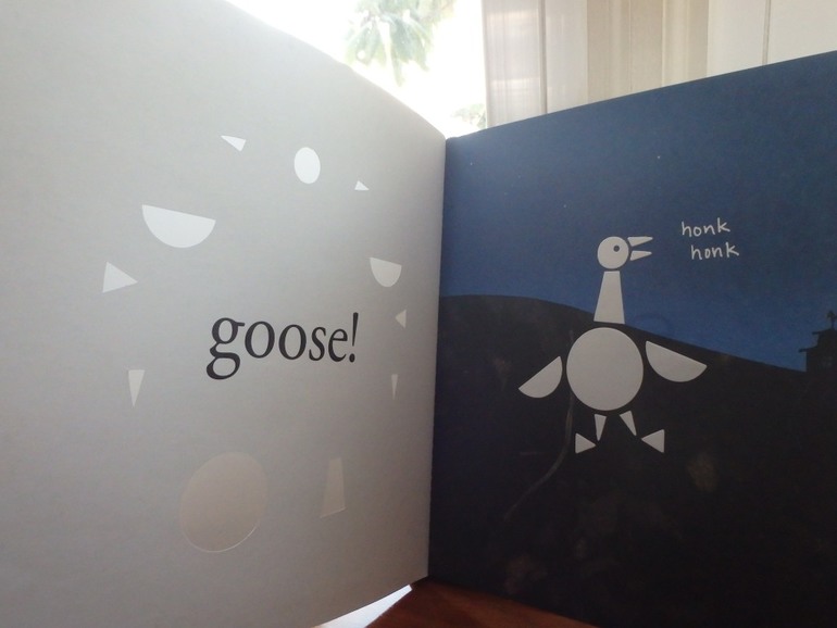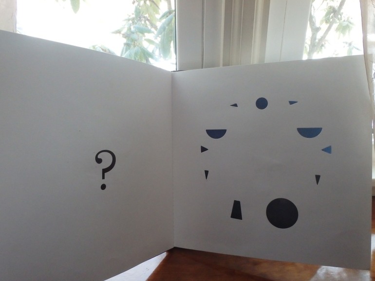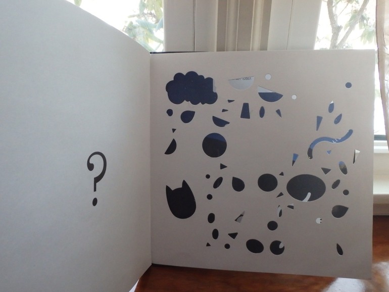По прорезанным контурам на странице предлашается угадать, кто из животных изображен на слудующей странице. Удивило, что на следующей странице все животные не просто нарисованы белым, это реальный кусочки бумаги на страницу приклеенные. Смысл делать такую дорогую работу не понятен, но на самом деле очень интересно.