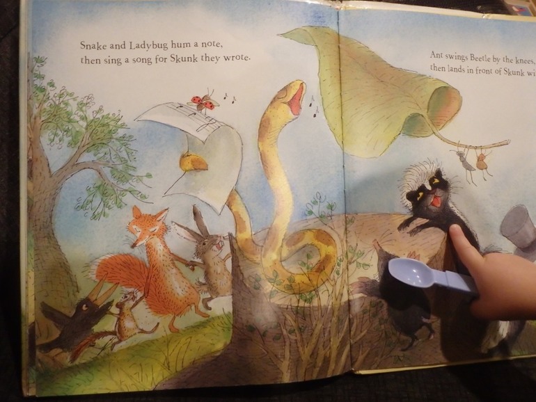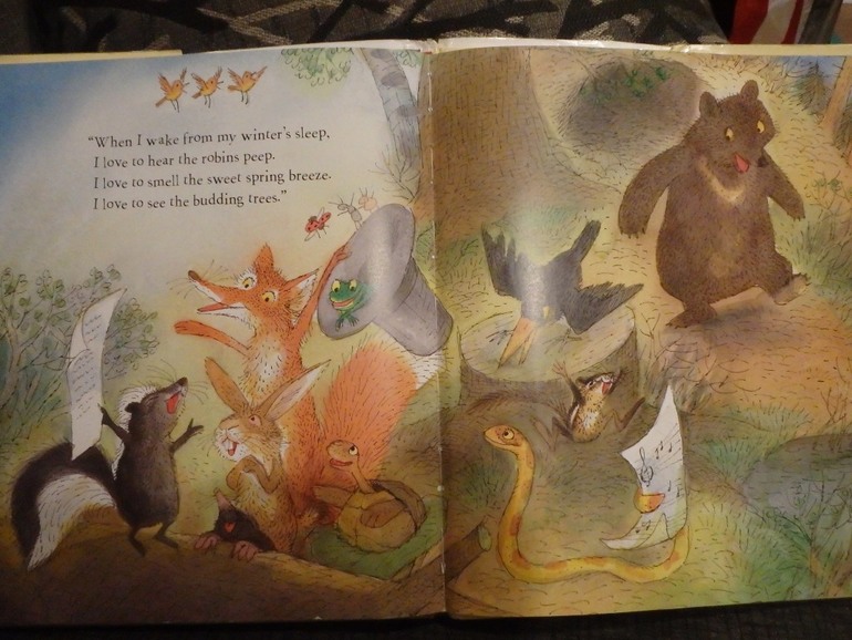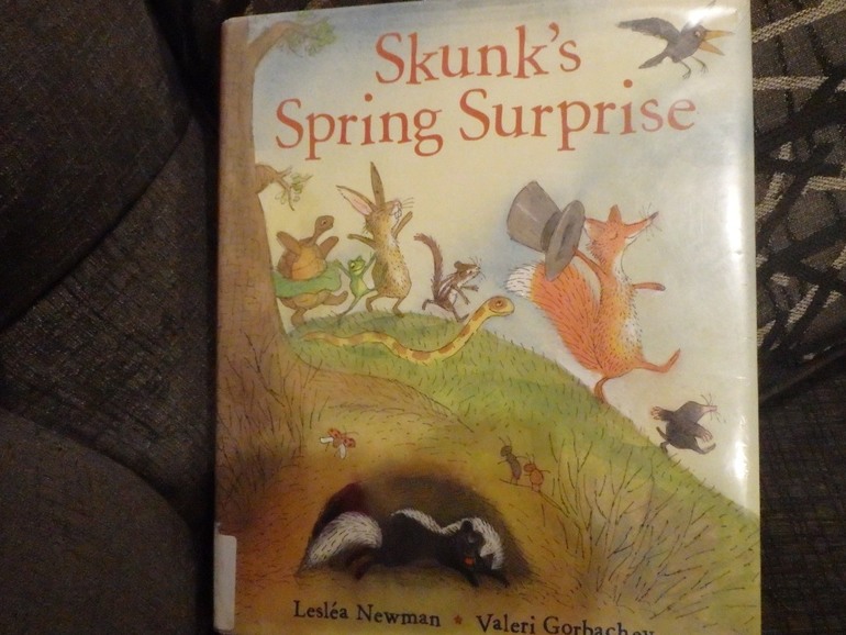 История незамысловатая. Скунс проснулся после долгой зимней спячки (я и не знала раньше, что эти зверьки отсыпаются всю зиму на пару с медведями), и пошел искать друзей. А те, к пробуждению скунса подготовили концерт, всю зиму репетировали. Только постарались его заранее предупредить о сюрпризе, чтобы друг не дай бог, не испугался чего-нибудь. Концерт удался. Все были рады и счастливы. Книжка милая. Но ничего особенного.