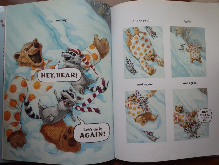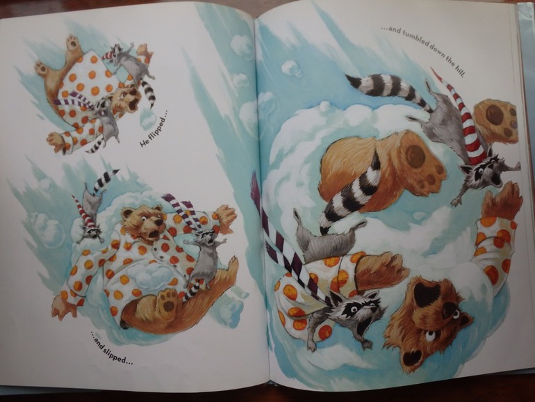 Эта история тоже ничем особо не запомнилась, прихватила ее на ходу, потому что она показалась по стилю похожей то ли на Лизелотту, то ли на Маму Му. Но при ближайшем рассмотрении ассоциации ослабели. История о том, как наступила зима, выпал снег, медведь собрался заснуть, а друзья еноты уговаривают его выбраться из кровати, чтобы поиграть последний раз перед началом спячки. Сначала медведь играть не хочет, потом недовольный выбирается из берлоги, потому что уж очень шумят эти еноты. Но в итоге, катится с горы, и обнаруживает, как это весело - кататься и кидаться снежками. А вдоваль нагулявшись отправляется домой и засыпает до весны. Можно почитать для создания зимнего настрония один разок.