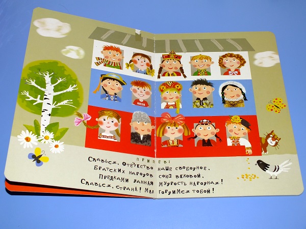 Триколор мы уже знаем (спасибо стихотворениям В.Степанова о России - младшая дочка просто фанатеет!), поэтому показываем его везде, где только можно!))) Так же и в этой книге, даже в обрамлении второго припева - и там разглядели бело-сине-красный.