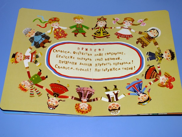 Иллюстрации радостные, яркие, веселые, по-настоящему детские. Мне мил хоровод на одном из разворотов, который водят дети в национальных костюмах. Да и поющие детки умиляют.