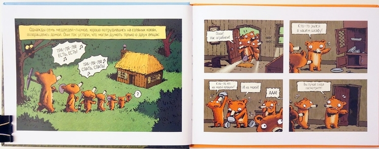 С этими мишками-гномами вечно происходят какие-то неприятности: то они умирают от голода, то великанша пробралась к ним в дом и уснула на их кроватках беспробудным сном, предварительно съев всю еду малышей. Кто же придет на помощь семи мишкам-гномам? Найдутся желающие! Перед юными читателями комиксов предстает целая галерея героев сказок, преимущественно Шарля Перро и братьев Гримм: Кот в сапогах, Мальчик-с-пальчик, Храбрый портняжка, Гензель и Гретель, Серый волк, Красная Шапочка, Белоснежка и многие другие. Причем, некоторые герои появляются под своими настоящими именами, а других придется распознать. Поэтому эти комиксы смогут доставить истинное удовольствие тем детям, кто хорошо знает и любит сказки. Им будет интересно и весело угадывать, откуда взята та или иная ситуация, тот или иной символический предмет, будь то яблоко, бобовое зернышко или пряничный домик.