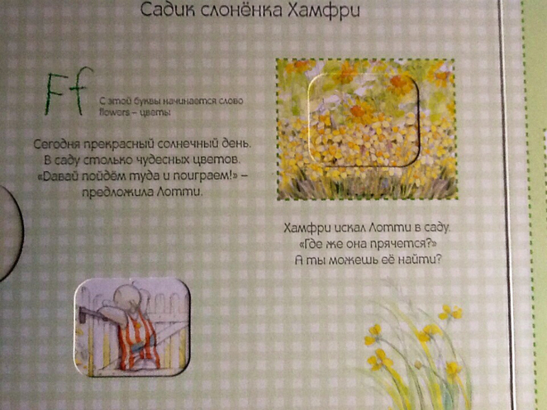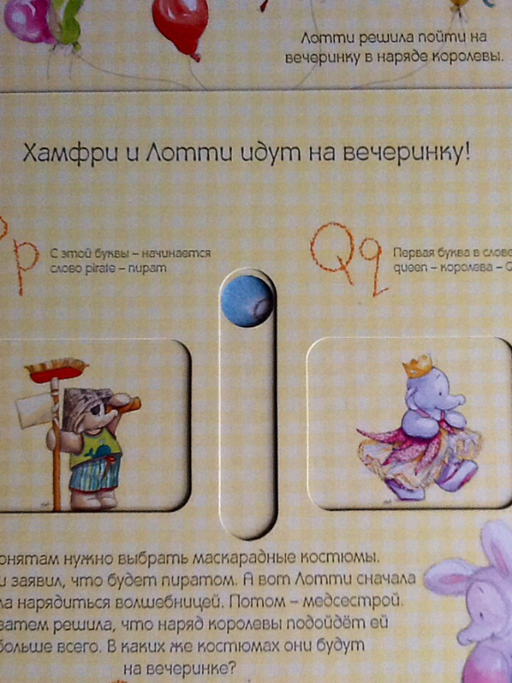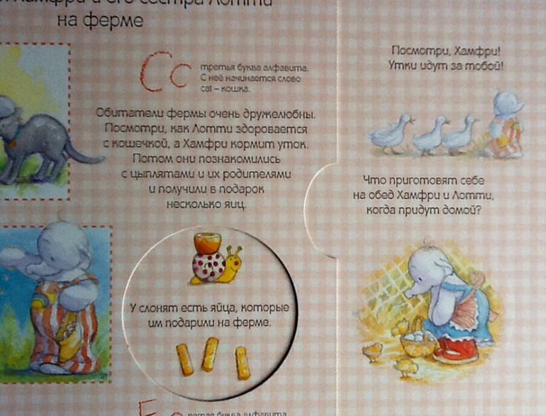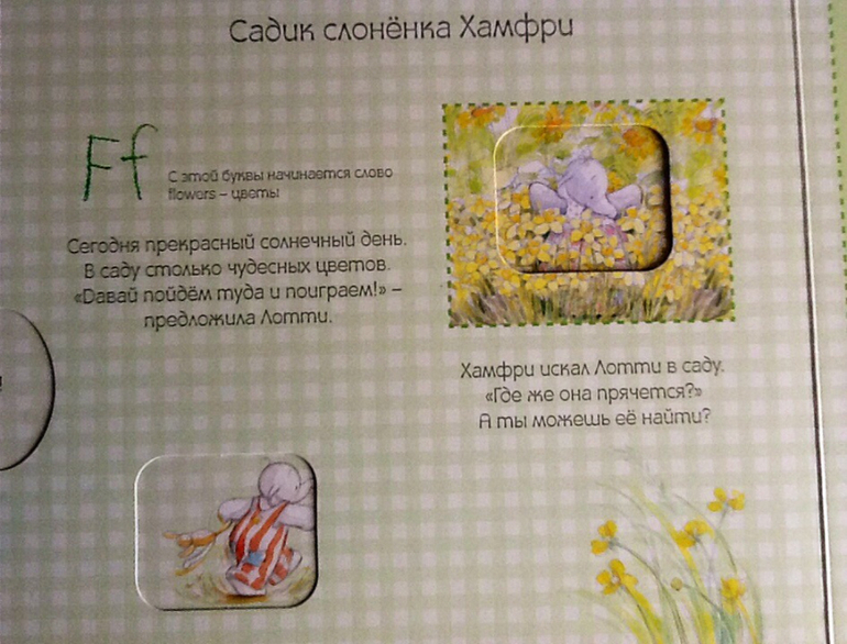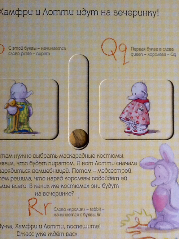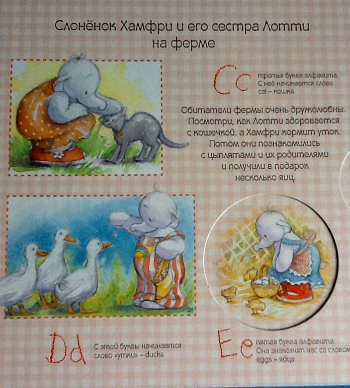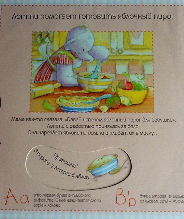 Книжка начинается с того, как сестренка Хамфри - Лотти помогает маме готовить яблочный пирог для бабушки. Лотти очень любит помогать маме и с радостью принимается за это дело. Сначала они нарезают яблоки и складываются их в миску. Дальше можно повращаться диск и узнать сколько яблок нужно Лотти для пирога. Параллельно малыш знакомиться с английским алфавитом. «Aa - первая буква английского алфавита. С нее начинается слово apple.» Далее в алфавитном порядке: буква и слово, начищающиеся на эту букву.