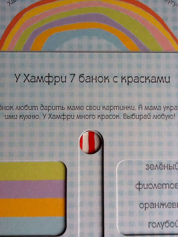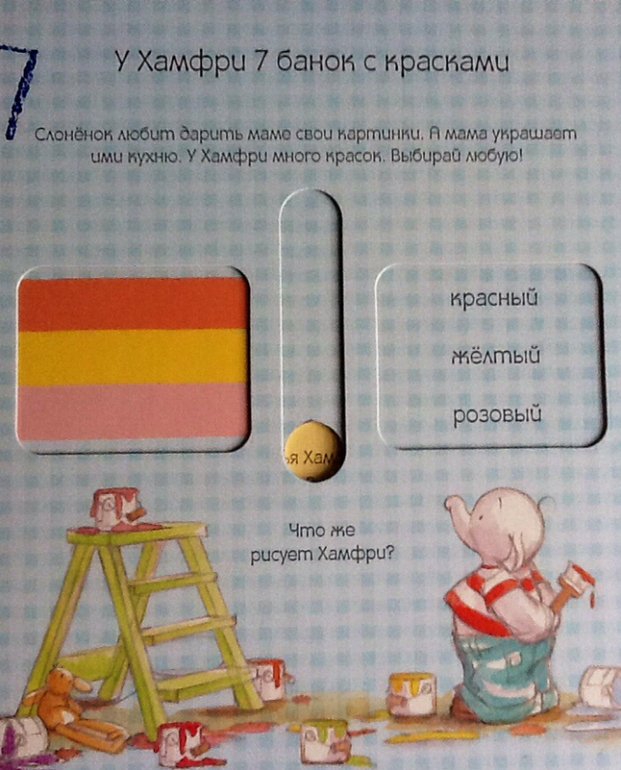 Тем временем Хамфри решил нарисовать картину для мамы. У него есть 7 банок с красками. Слоненок нарисовал красивую радугу.