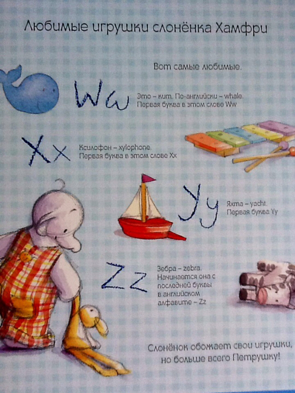 А вот и самые любимые игрушки Хамфри : кит - whale, ксилофон - xylophone, яхта - yacht, зебра - zebra.