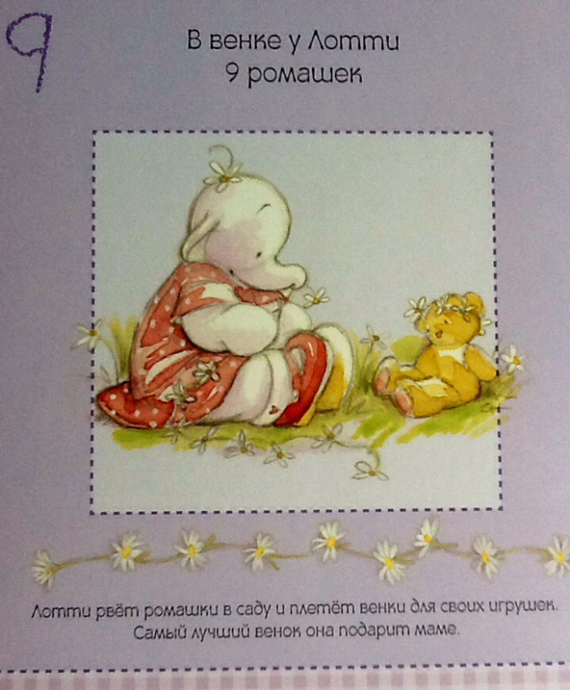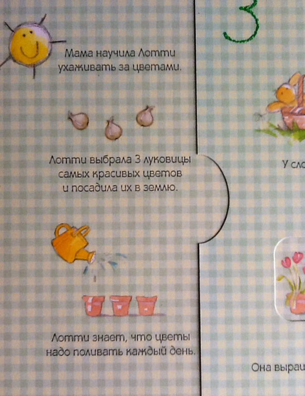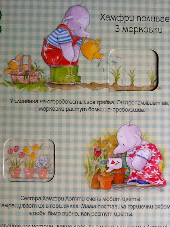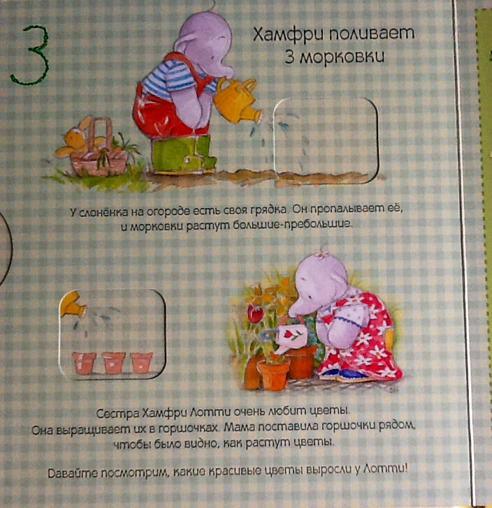 Добрая и ласковая мама научила слонят ухаживать за садом и огородом. Хамфри поливает 3 морковки, а Лотти посадила 3 цветочные луковицы. Лотти знает, что цветы нужно поливать каждый день.