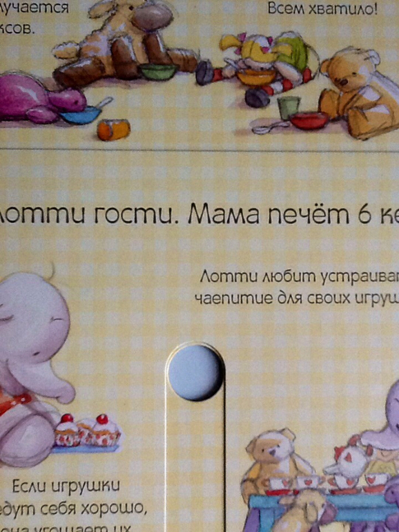 В книжке есть вращающиеся и выдвигающиеся элементы. Книга большого формата, странички из очень плотного картона. Милые и уютные иллюстрации.