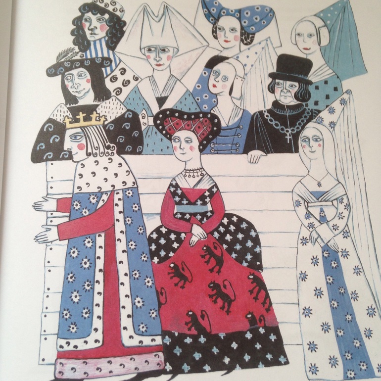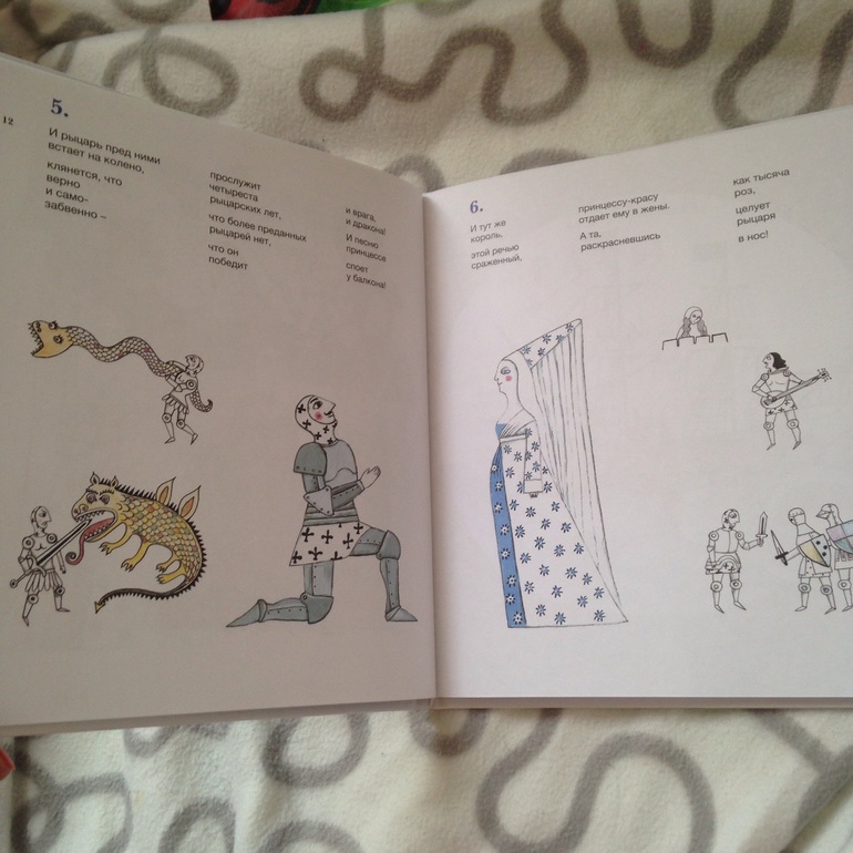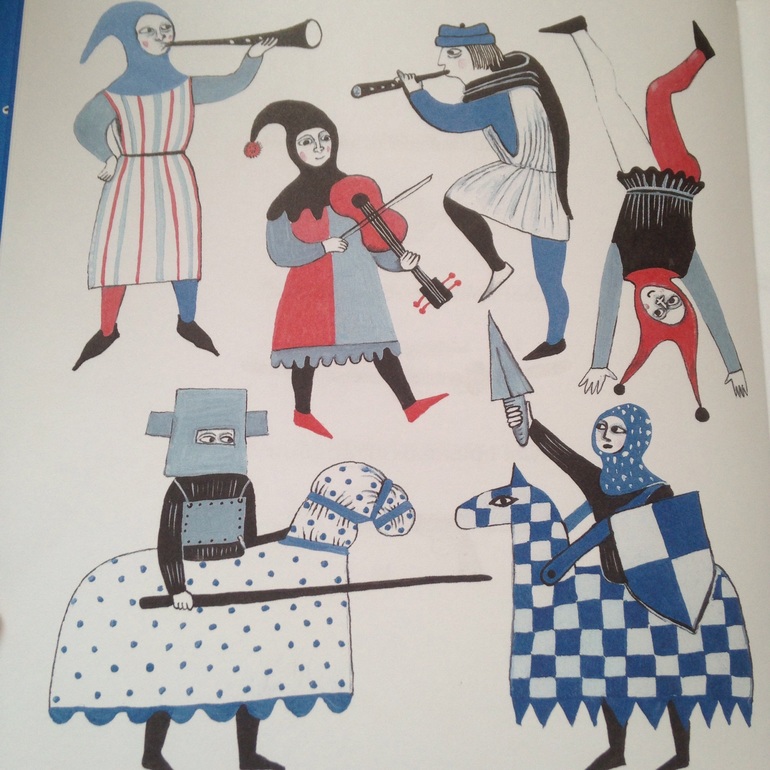 Идет рыцарский турнир, рыцари в доспехах,латах , на конях, принцесса и вся королевская семья на трибунах , придворные шуты веселят народ. Кто победит, тот получает звание сэра и набирается смелости встать на колено перед принцессой, чтобы породниться с королем. Вполне понятное описание королевских времен средневековья. Я бы своими словами и не смогла это рассказать, а тут по картинкам легко воссоздать. Еще что важно, нет нагромождения картинок. Рисунок крупный на весь лист на белом фоне. Так проще малышам воспринимать незнакомую информацию, тем более не из обыденной жизни.