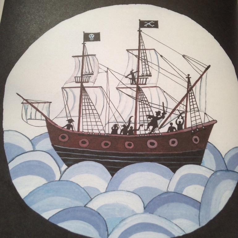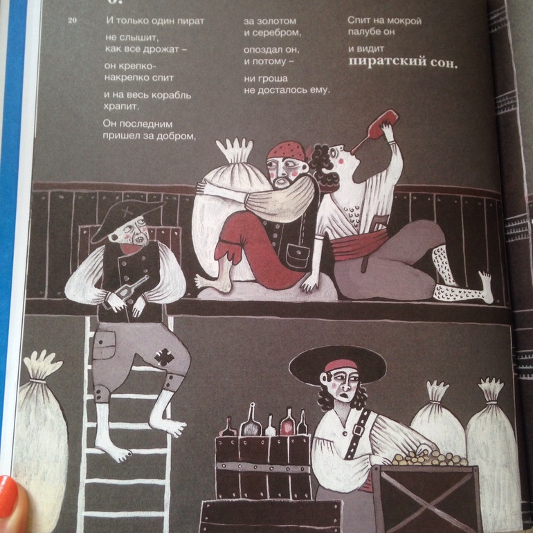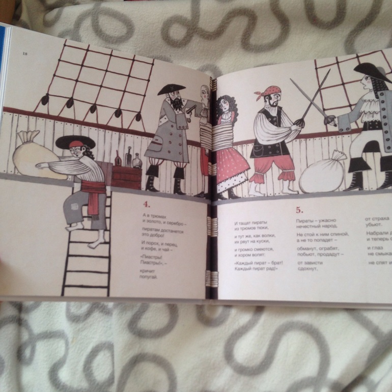 Пиратский корабль, куда ж без него. Команда на своем корабле готовится к защите от пиратов. По ходу перечисляются все корабельные должности: матросы, боцман, лоцман, кок,юнга, мичман-можно рассказать отдельно кто это. Капитан-пират классического вида: с попугаем на плече, крюком вместо руки, повязкой на глазу, костылем. Обозначена цель захвата-перевозимые на корабле богатства и продовольствие. Что важно, говорится о том, что пираты грабят, бьют. Зачастую пираты кажутся какими-то очень интересными, и мальчики хотят подражать. А тут все честно .