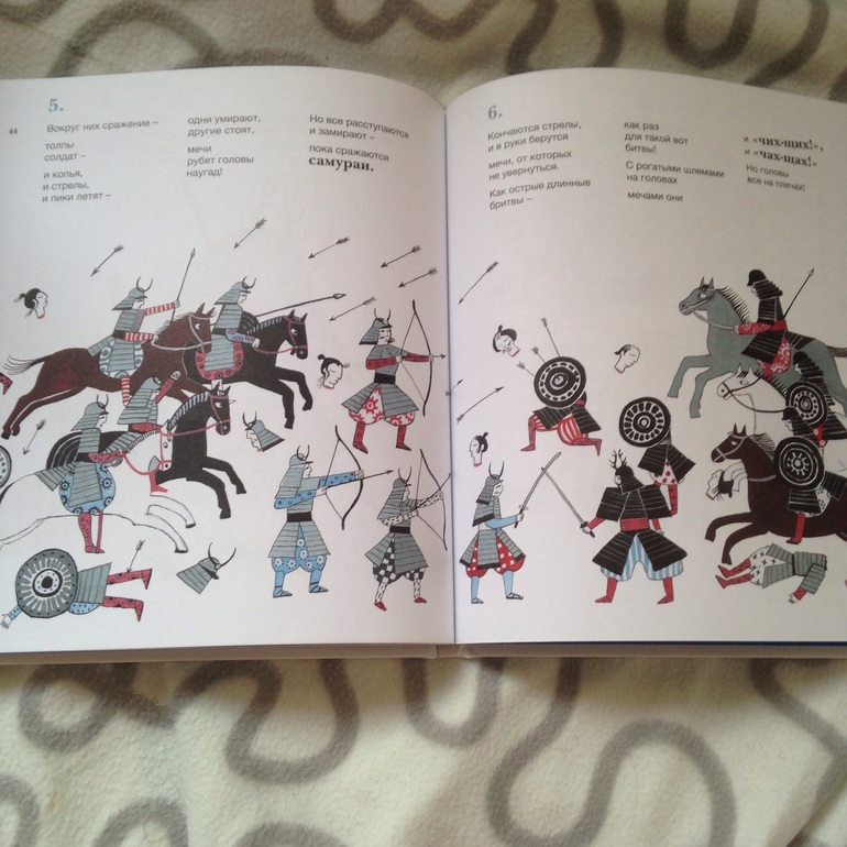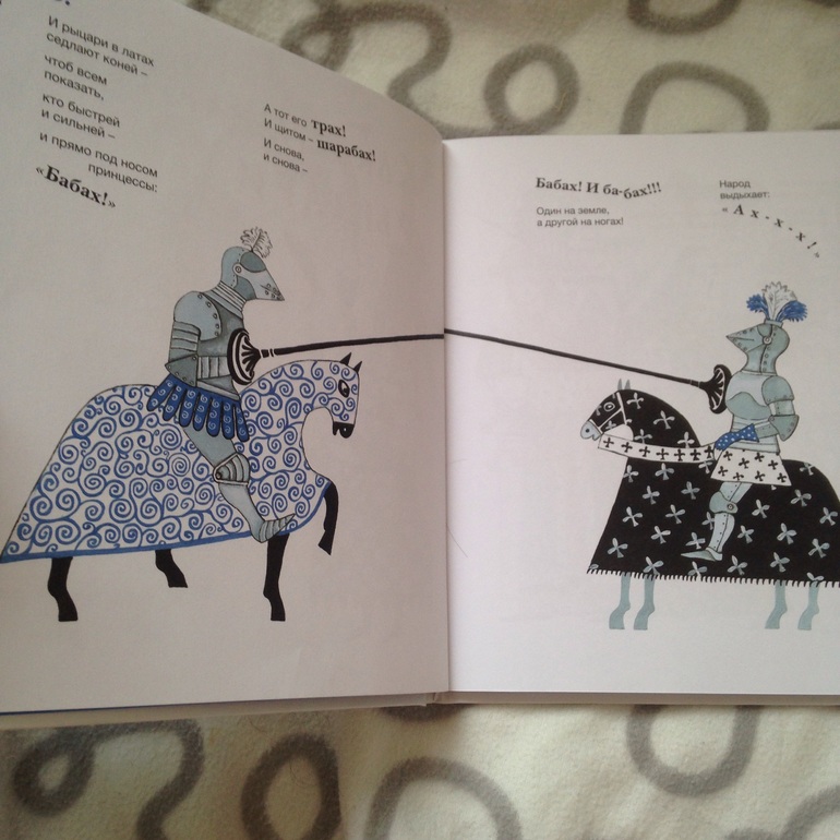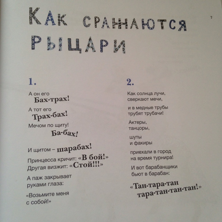 Очень динамичный слог. Попробуйте прочесть кусочки на фото. Как марш! При этом очень эмоционально-даже строчки текста вылетают из ровной линии. И легко разыгрывается по ролям, а сына веселит шум звуков от всех этих " Трах-бабах".