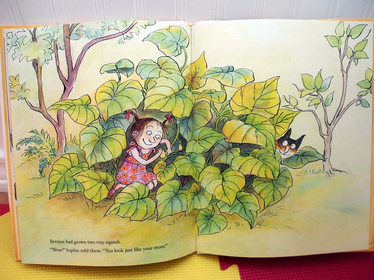 А когда наступила весна, Софи обнаружила в саду росток. И все лето следила за тем, как он растет, и на кабачковом кусте выросли целых две кабачка - детки Бернис, которые идеально подходили в ладони девочки и с которыми так интересно было играть.