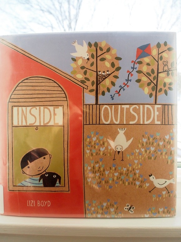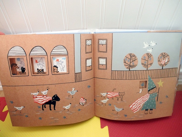 В книге ппоказан целый год жизни мальчика. Разворот внутри дома, разворот - на улице. На страничках есть прорези, в которые удобно подглядывать, мы с Ваней только и делаем, что глазеем через окошки.