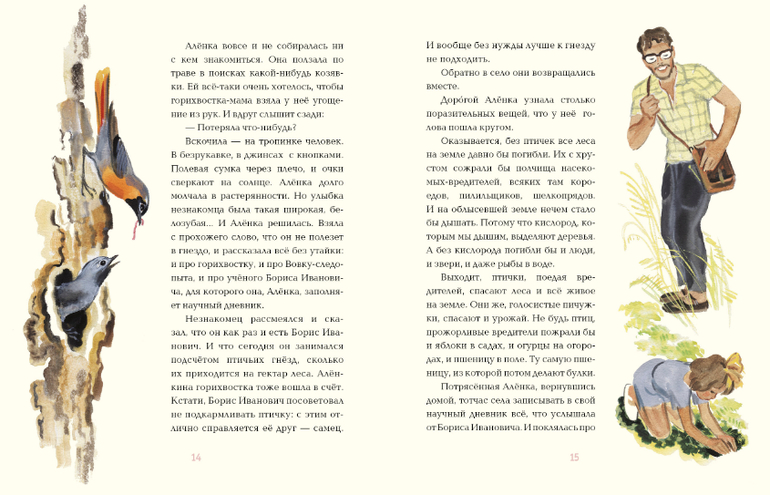 Книга Виктора Балашова "Алёнкин выводок" с иллюстрациями Андрея Брея - рассказ о том, как девочку Алёнку отправили на отдых в деревню Пичугино, настоящее птичье царство-государство. Здесь она вступает в отряд следопытов - ребят, которые заботятся о лесных зверях и птицах, не дают их в обиду и ведут наблюдения. А Алёнка берёт шефство над птицей горихвосткой и её птенцами.