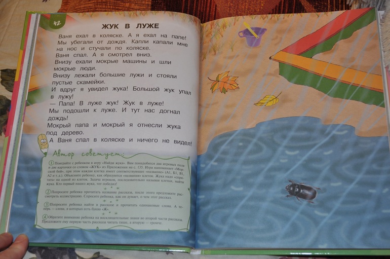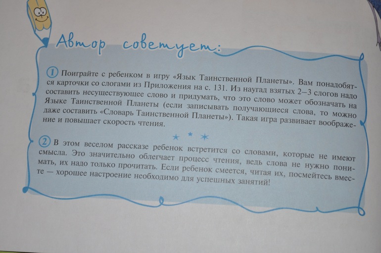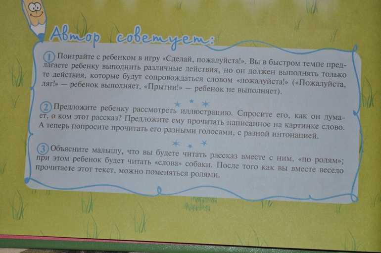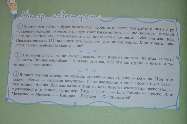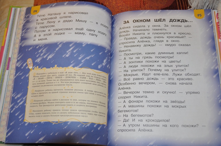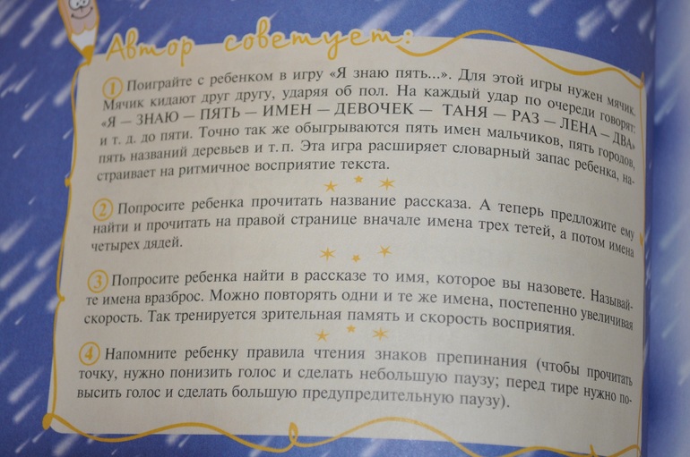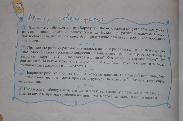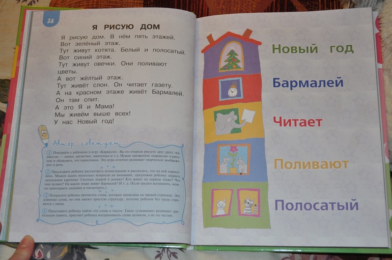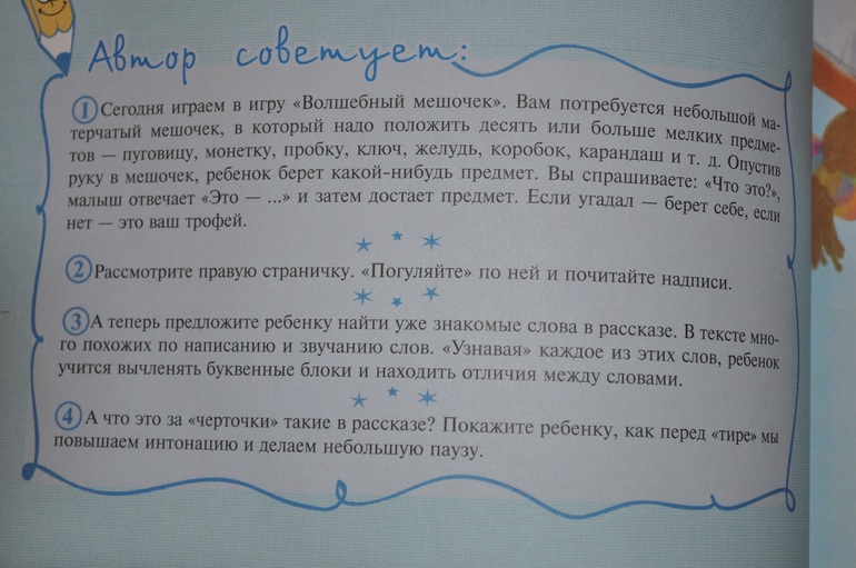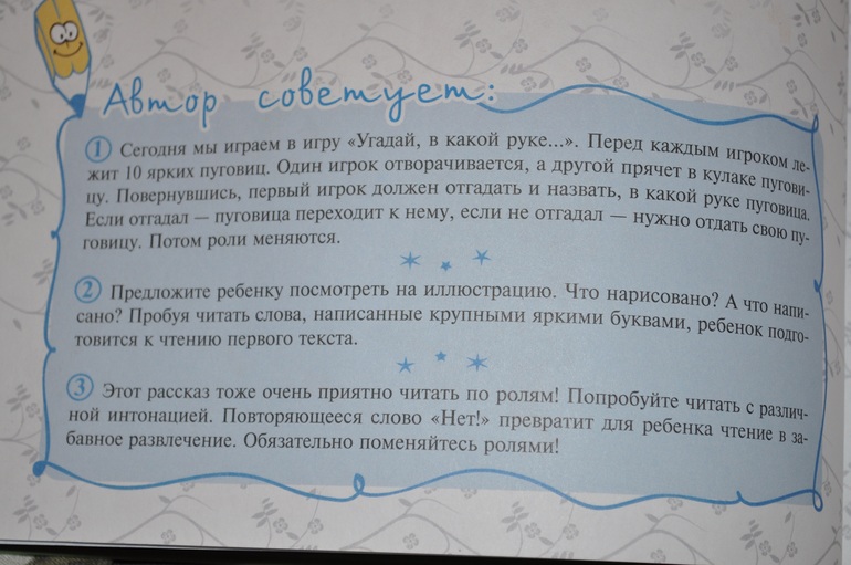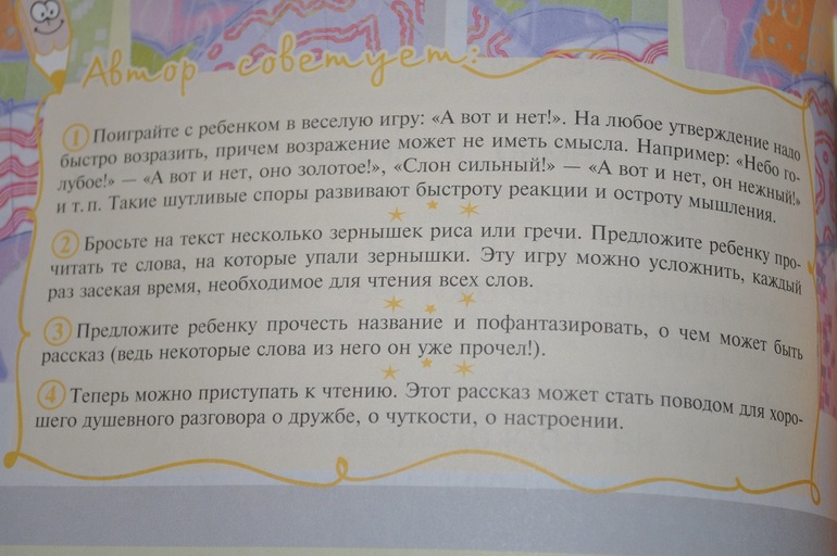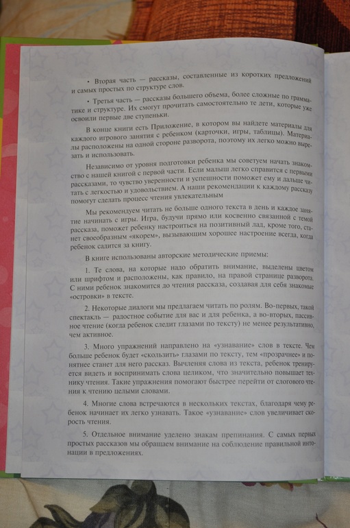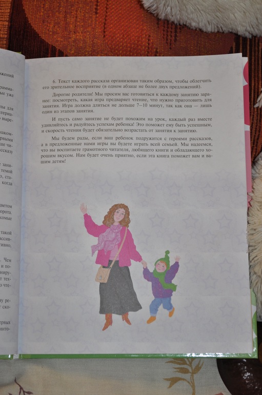 Случайно наткнулась в ЖЖ на положительный отзыв о ней. И т.к. вопрос "что читать, чтобы учиться читать" для нас сейчас очень актуален, книгу я, увидев, быстренько заказала. И сейчас вот села внимательно рассматривать. И, надо сказать, книга полностью оправдала мои ожидания! Правда, я пока изучила только первую часть, ведь мы на этом этапе (книга условно разделена на 3 части по уровню сложности). Простые, но при этом интересные и понятные ребенку рассказы. К каждому рассказу рекомендации автора и как читать и, что мне очень понравилось - в какую игру, связанную с текстом рассказа, поиграть. Для некоторых игр есть карточки в приложении (их надо будет предварительно вырезать). Правда, иллюстрации в "лучших" традициях АСТ - и по стилю, и по качеству печати. Но, видимо, все и сразу бывает только в мечтах. Ребенок еще книгу не видел, но, надеюсь, оценит!