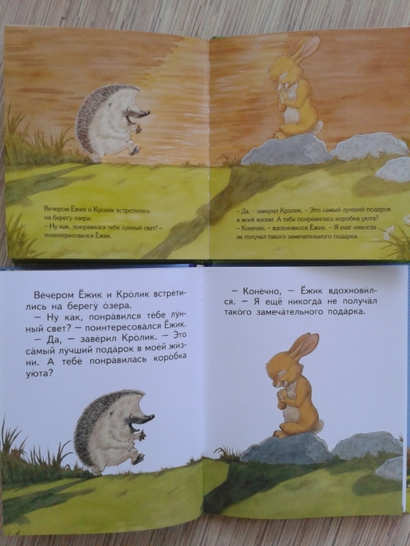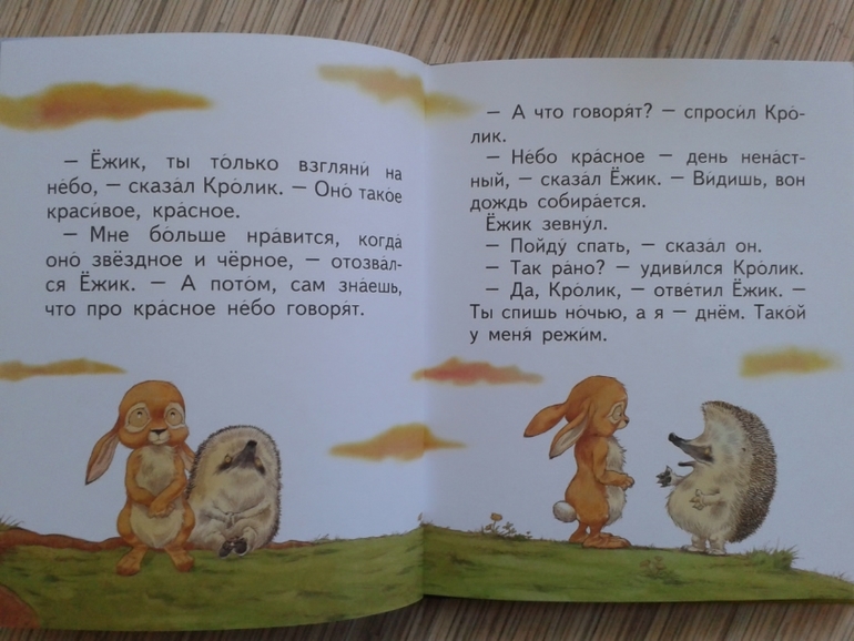 Нам до самостоятельного чтения еще далеко, а вот сами истории как раз по возрасту. Очень трепетная у этих милашек дружба. Ёжик и Кролик хоть и бодрствуют в разное время суток (ёжик ночью, а кролик днем) , но находят время для общения, заботятся друг о друге, и даже если ссорятся , то не на долго. Очень хороший пример НАСТОЯЩЕЙ ДРУЖБЫ для детей.