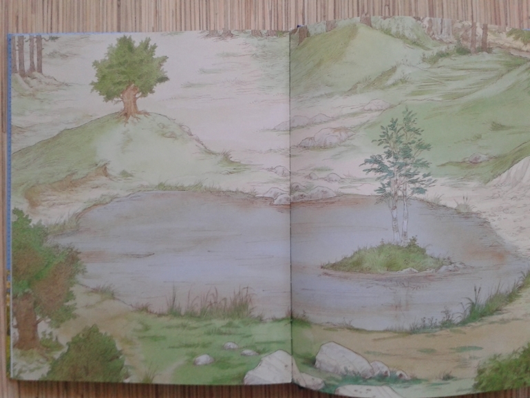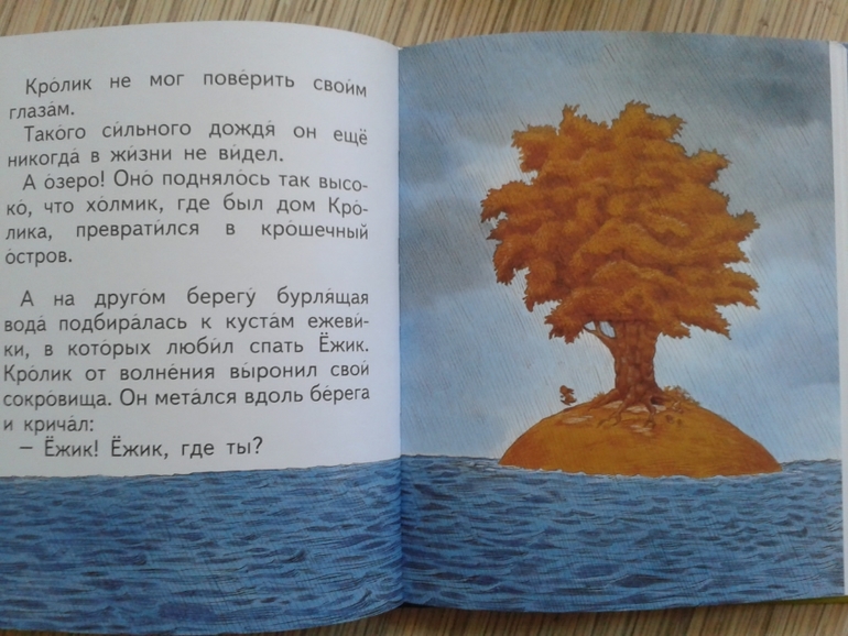 Местами иллюстрации затемнили даже слишком. Особенно это заметно вот в этой истории. Тут Ёжик и Кролик стоят около зеленоватой воды.