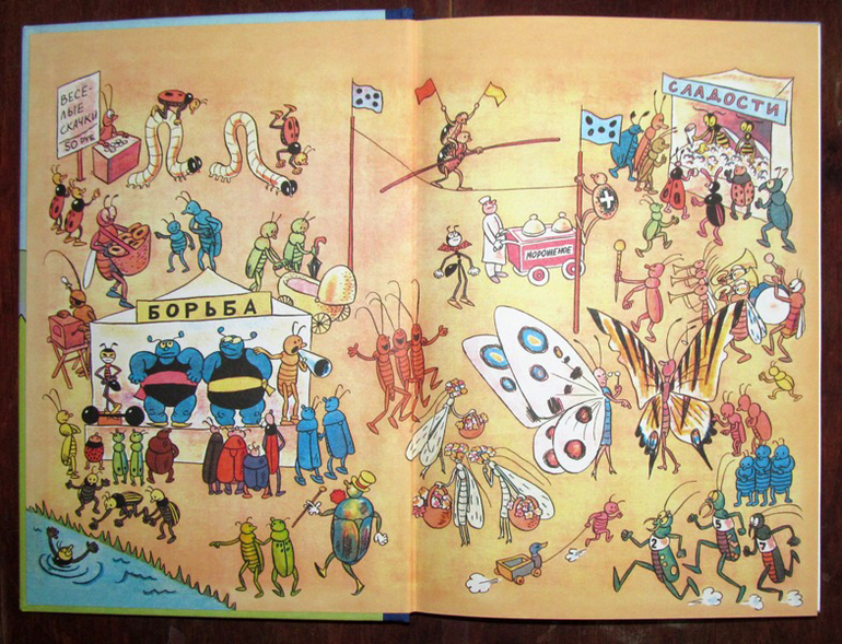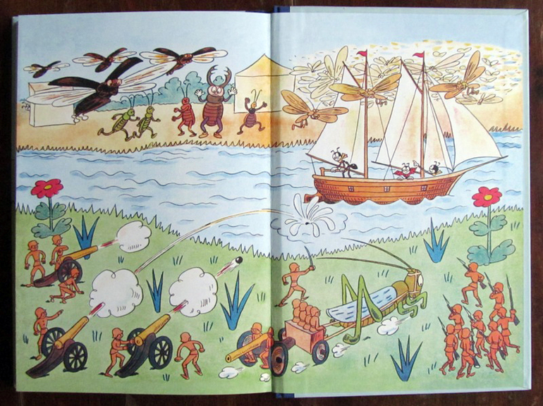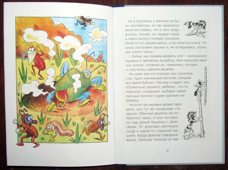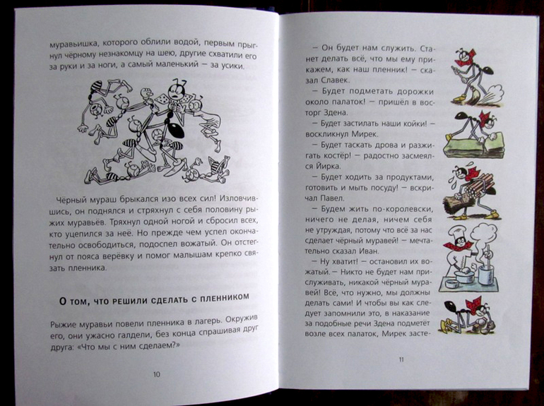Несмотря на то, что читать про муравья мы начали со второй книги, повествование было вполне понятно. Тем более, что было объяснение каким образом Ферда очутился в небе на дирижабле. Но это чуть позже. А начинается всё с описания жизни маленьких обитателей лесного детского лагеря, которые, оказывается, вовсе не дети, а рыжие лесные муравьишки. Вот, к ним-то в лапки и попадет черный муравей Ферда (упал его дирижабль).