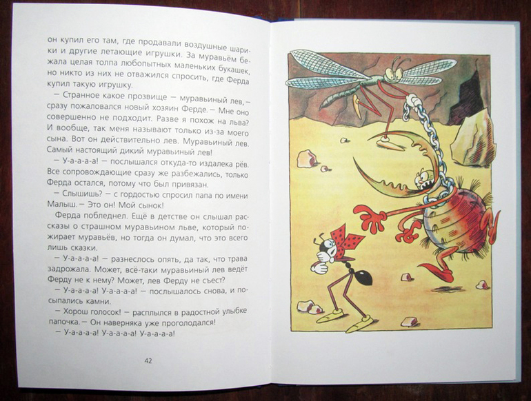 Возрастная маркировка сказки - 6+, но также указано, что она рекомендуется детям младшего школьного возраста. Старшим дошкольникам, на мой взгляд, тоже можно читать, но, только учитывайте, что сказка эта про особый мир насекомых, где периодически кто-то кого-то ест... А сынок муравьиного льва просит Ферду просто о невозможном - чтобы тот приводил к нему на съедение своих же братьев - муравьев. Ну, уж этого-то Ферда никак не может выполнить!