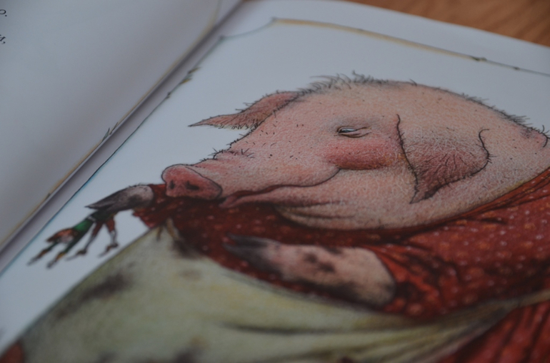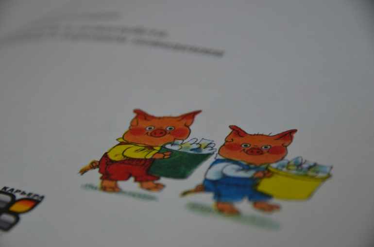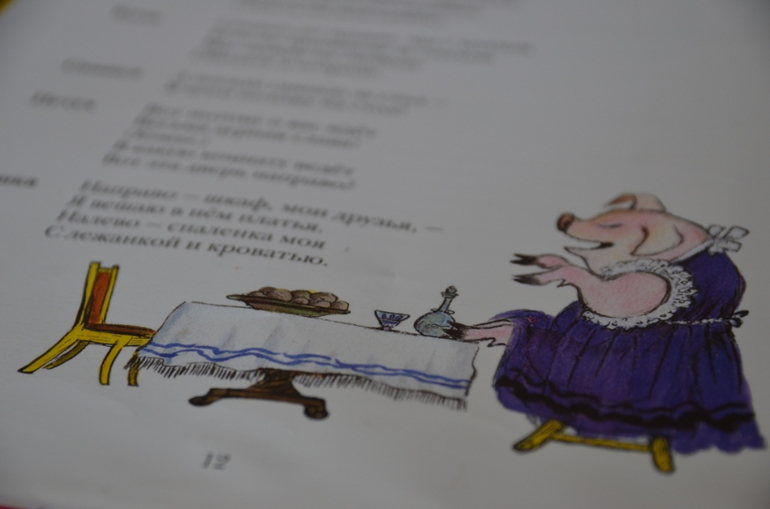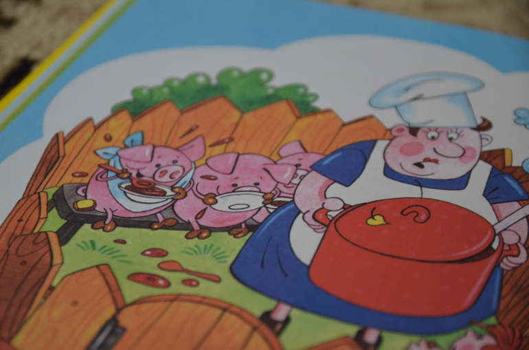 Сюжет, где свинья обедая кладет ноги на стол, неизменно сопровождается демонстрацией данного действия, с причитанием, что делать так нельзя...