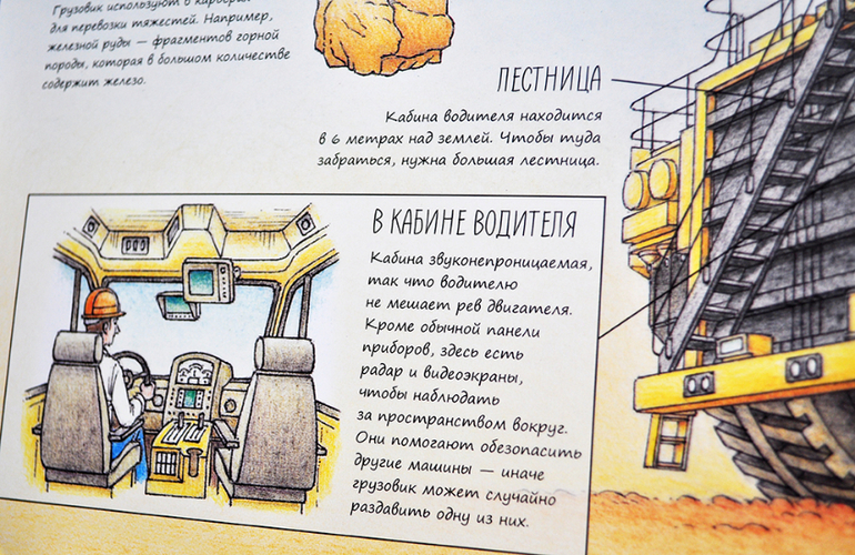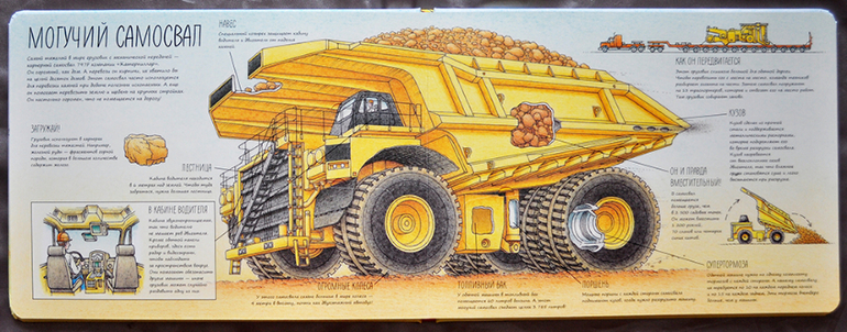 Книга содержит 16 очень плотных картонных страниц. которые даже при большом желании повредить достаточно тяжело. Всего 8 разворотов о самом большом транспорте на планете, его устройстве и назначении: