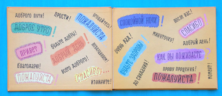 Отдельно хотим обратить ваше внимание на форзац. Если театр начинается с вешалки, то эта книга, безусловно, с форзаца. Как вы понимаете, в диафильме форзаца в принципе не было, поэтому его мы сделали сами. Всей редакцией подбирали вежливые слова, а художественный редактор собрала из рукописных букв Брея целый алфавит и вручную сделала из этих букв те слова, что вы увидите в книге.