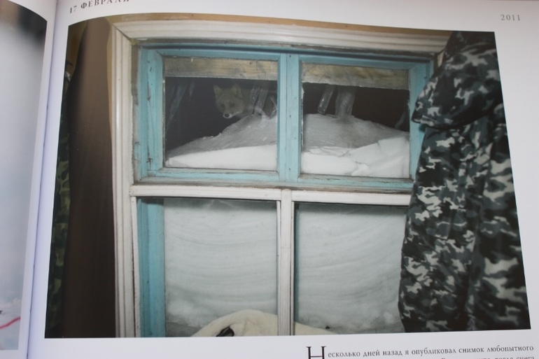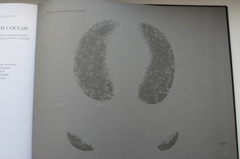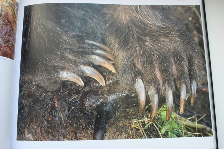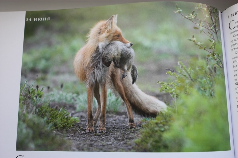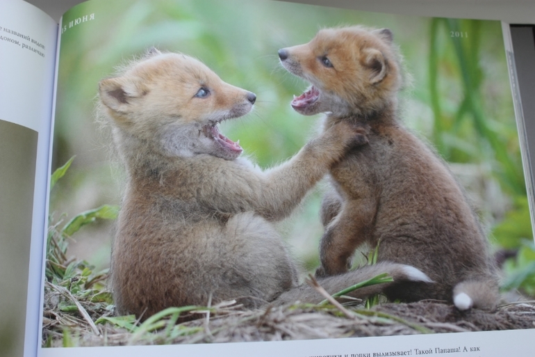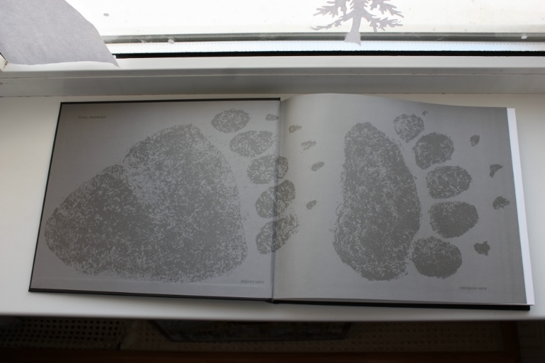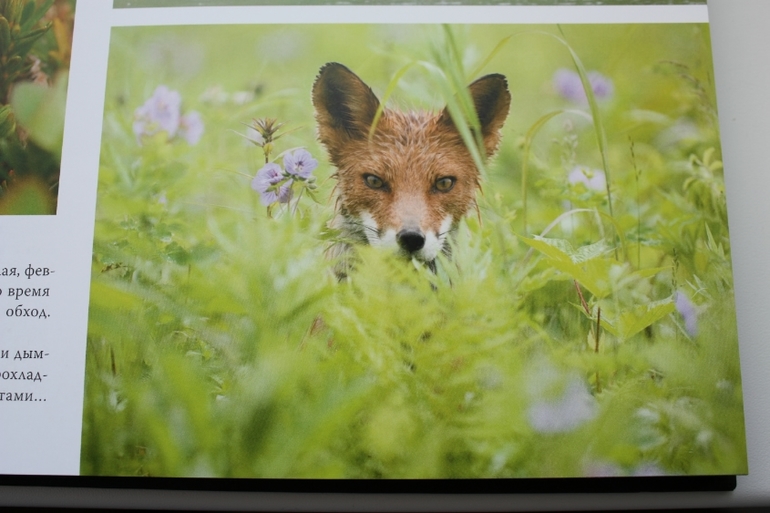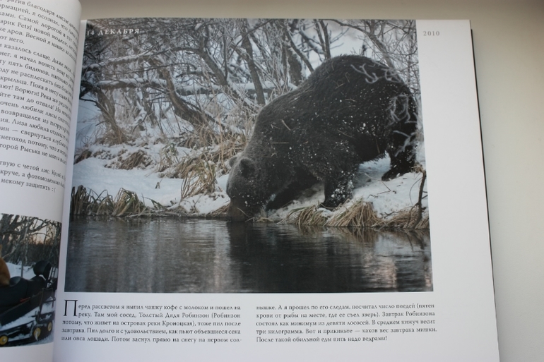 ). Бумага подобрана идеально: на ней и фотографии вышли чёткими, яркими, и текст читается комфортно - нет бликов, как на слишком глянцевых страничках. Формат у книги альбомный, переплёт твёрдый. Обложка не очень удачная - матовая, поэтому все жалуются на потёртости и пятна даже на новеньких, завёрнутых в заводскую плёнку экземплярах, но тут уж ничего не поделаешь. На форзацах помещены отпечатки лап некоторых животных в натуральную величину. Если медведя, лису и лося мы по следу сразу узнали, то над северным оленем долго гадали (я прикрыла подписи рукой).В первый раз листали книгу всей семьёй: с мужем и сыном. Испытали шквал эмоций. Здесь есть и весёлые моменты: любопытные лисички, заглядывающие в окна избушки, молодой волонтёр в недрах пустующей медвежьей берлоги, писающий стоя медведь-мужик, снимки разноцветных "последствий" разнообразной медвежьей диеты... Есть и грустные:снимок попавшегося в брошенные рыбацкие сети лиса, фото лисьей норы, разворошённой медведями, последний снимок погибающего от голода медведя-шатуна... Грустно, но было бы нечестно показывать только радостные моменты, умалчивая об остальном. А так книга получилась правдивой и очень настоящей. К слову, и создана она была с целью привлечения внимания к проблемам охраны живой природы и важности бережного к ней отношения. Ведь большинство бед для животных (если не все) исходят от человека...