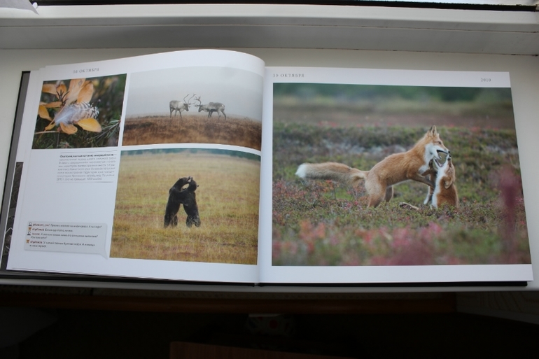 ).Вообще, книги-фотоальбомы о живой природе пользуются у нас дома большой популярностью: их листает пятилетний сын, временами пробегает глазами муж, я и вовсе просмотрела каждый "от корки до корки" не один раз, их одалживают на время бабушки, тёти, дяди (а после нередко просят и себе экземплярчик в подарок)... Поэтому удивить нас сложно. Но у этого альбома получилось. Это не просто книга с фотографиями, это по сути - оживший ЖЖ популярного блогера, вышедший в бумажном виде. (Кстати, после покупки книги, я подписалась на интернет-дневник автора, читаю его с не меньшим удовольствием). Вместе с этим изданием читатели могут прожить 370 дней в чудесном камчатском заповеднике, увидев самые яркие моменты из жизни его обитателей, снятые объективом автора. Охвачен период с 12 сентября 2010 года по 17 сентября 2011. Всё это время Игорь Шпиленок прожил практически в одиночестве на одном из кордонов Кроницкого заповедника. В тот период подписчики в живом журнале Игоря могли фактически он-лайн знакомиться с материалами, опубликованными в этой книге, ведь на кордоне, к счастью, был интернет. Издатели даже поместили часть комментариев из интернет-дневника в книгу. Получились своеобразные выдержки из рубрики "вопрос-ответ". Вообще, издание оформлено очень приятно. Качество печати фотографий - просто шикарное (на мой непритязательный взгляд
