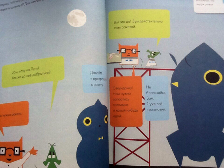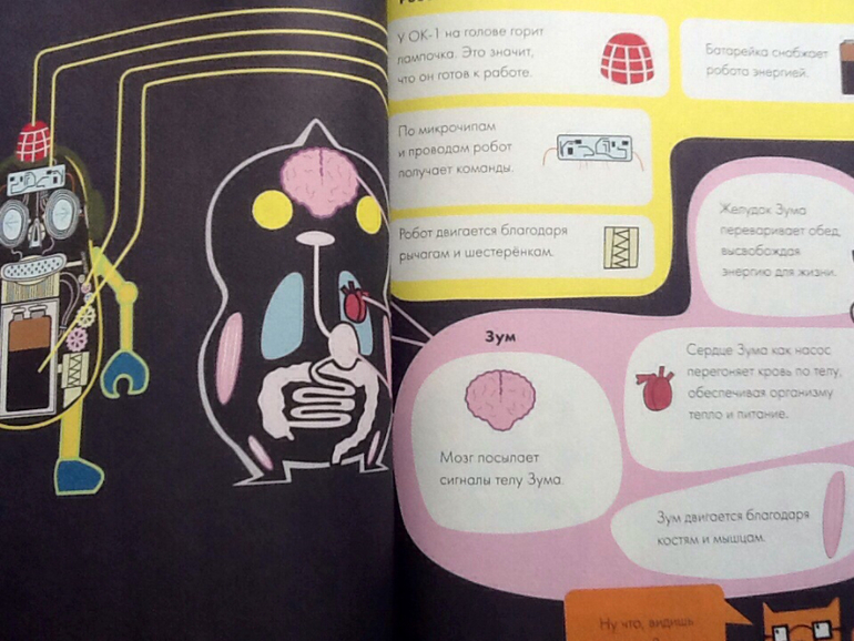 Первая книга - « Что внутри?». Самым маленьким и любопытным. Книга состоит из 5 разделов. В каждом разделе несколько тем. Первый раздел посвящен человеческому телу. Помогать знакомиться с инфографикой будут забавные персонажи Зим, Зум и Зам. Этот раздел поможет малышу узнать как растет человек, как он двигается, что происходит с пищей, когда она попадает в наш организм.