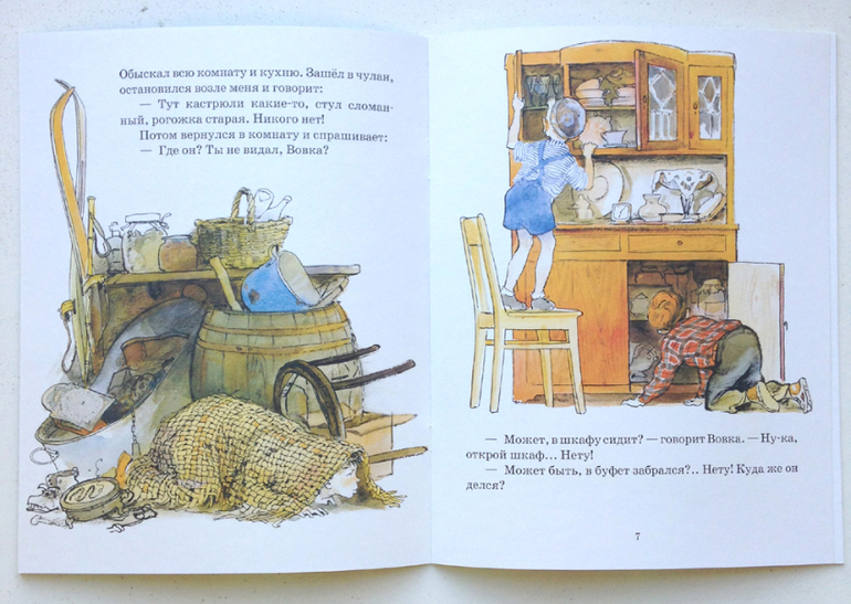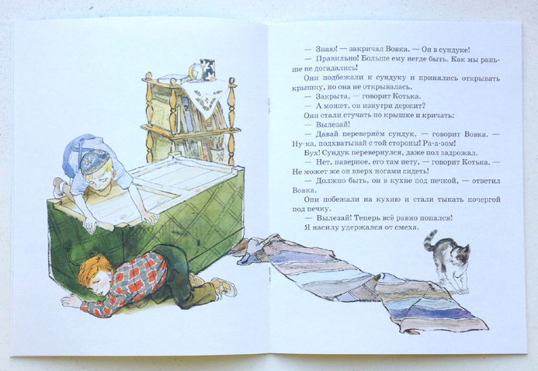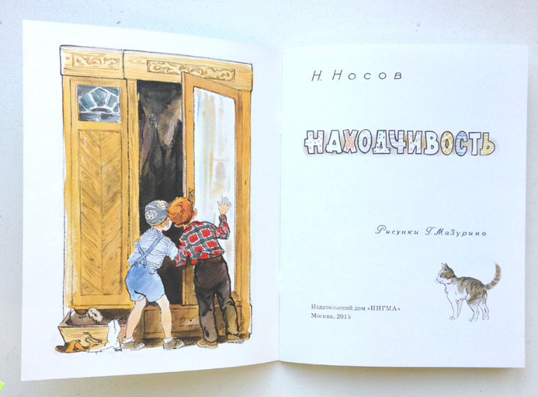 В издательстве «Нигма» рассказ Николая Носова «Находчивость» выходит с иллюстрациями Германа Алексеевича Мазурина - художника, как никто другой способного заглянуть в озорную мальчишескую душу. Эти иллюстрации были созданы еще в шестидесятых годах, при жизни Николая Носова. И сегодня мы можем рассматривать их бесконечно! Вот мальчишки с замиранием сердца заглядывают в большой темный шкаф, а вот уже рыщут по полкам комода. Кто из нас в детстве не играл дома в прятки? Уверены, что таких нет! Пусть же небольшой рассказ Носова не только напомнит вашим детям об этой чудесной игре, но и покажет что бывает, если несколько переусердствовать.