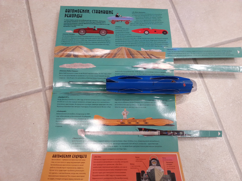 Про машины - тоже не хуже. Всё двигается. Что ни страница - то вокзал, трэк, соревнования. Каждую машину можно открыть, она едет, двигается. В какой-то открываются окна. Сын час сидел - двигал.