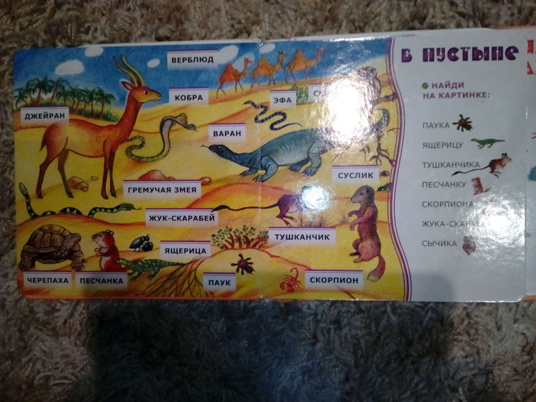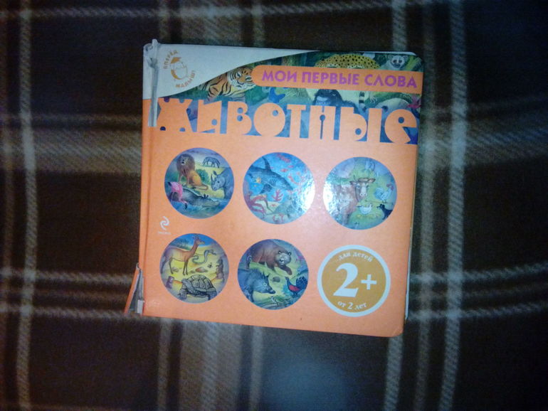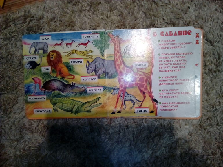 Животные на каждой странице сгруппированы по месту обитания, иллюстрации понятные и красивые. Плюс вопросы для занятий. У нас достается каждый день по нескольку раз, сейчас играем так, я называю животное, а Никита ищет его в книге и показывает мне. Если может сказать, то озвучивает его. Вариантов занятий по этой книге масса.