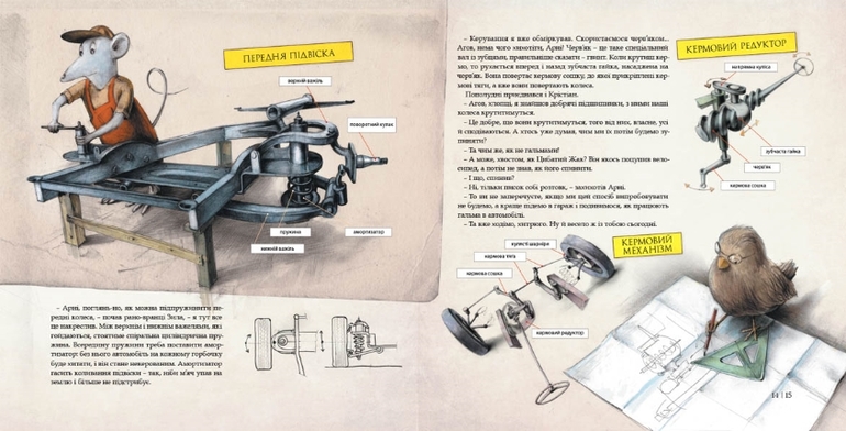 Двоє друзів, пацючок Арні і горобець Зила, надумали змайструвати автомобіль. До них приєднався жабун Крістіан, який вміє роздобувати все необхідне, тож можна весело братися до роботи. Наші герої живуть на околиці, поблизу старих дворів, майстерень і великого звалища. У такому середовищі меткий розум і гострий язик їм аж ніяк не зашкодять. Читаючи цю історію, сповнену пригод і труднощів, ви зрозумієте, як влаштований автомобіль і як він функціонує. Ви зможете дізнатися, як працюють двигун, зчеплення, гальма, а також - чимало цікавого.