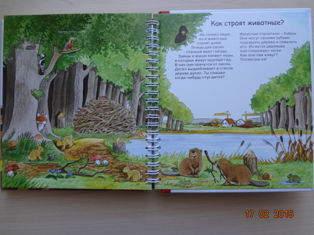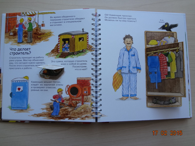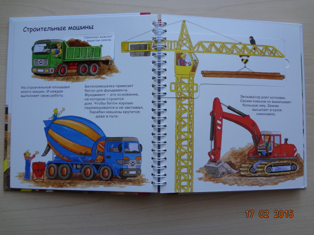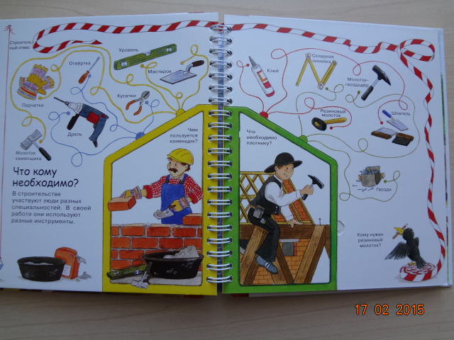 Конечно эта книга ни на один год. Сейчас мы с Андрюшей рассматриваем строительные машины. А наш любимый разворот там, где изображены рабочие инструменты. И это всё благодаря бобру Кастору))), о нём я писала здесь. А после трёх лет можно уже более конкретно рассказывать об этапах строительства.