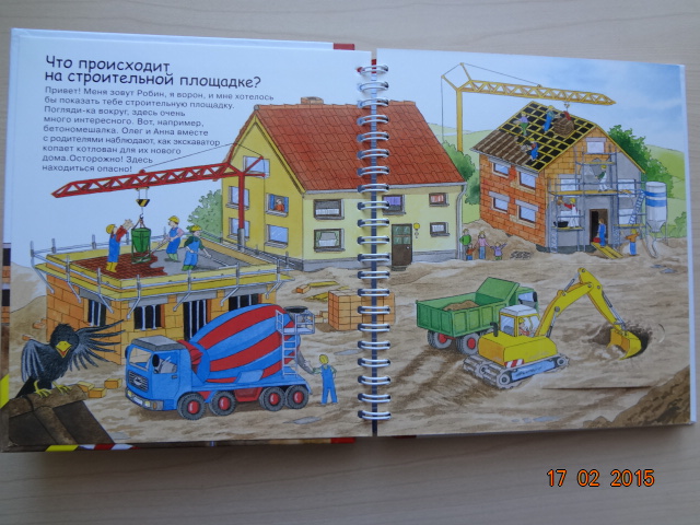 Благодаря этой книге мы узнали, что происходит на строительной площадке, какие бывают строительные машины, что делает строитель, что необходимо строителю, каменщику, плотнику, электрику, плиточнику, как строится дом, как строят дороги, как строят в других странах и как строят животные.