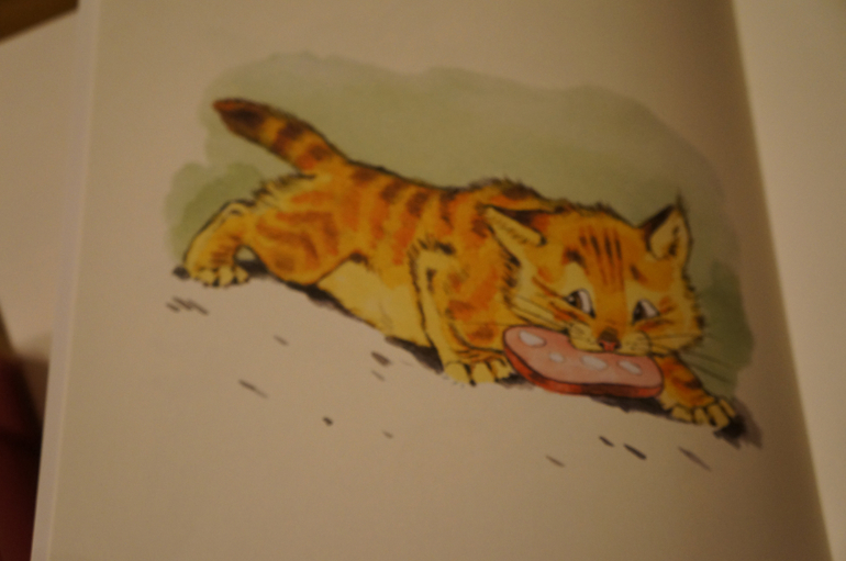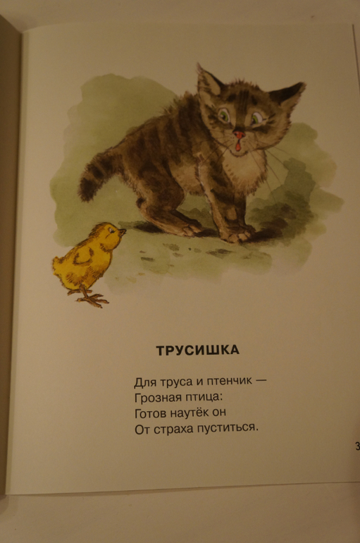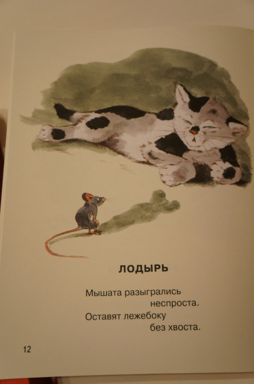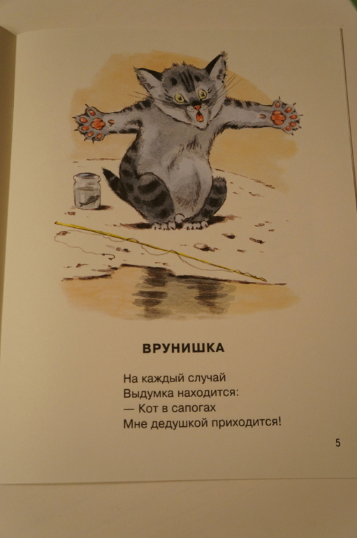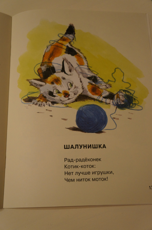 Очень красивые картинки. На каждую потешку отводится весь разворот книги. С одной стороны большой кошак (представляете в книге 11 разных полностраничных кошек!). с другой стороны текст и иллюстрации к нему.