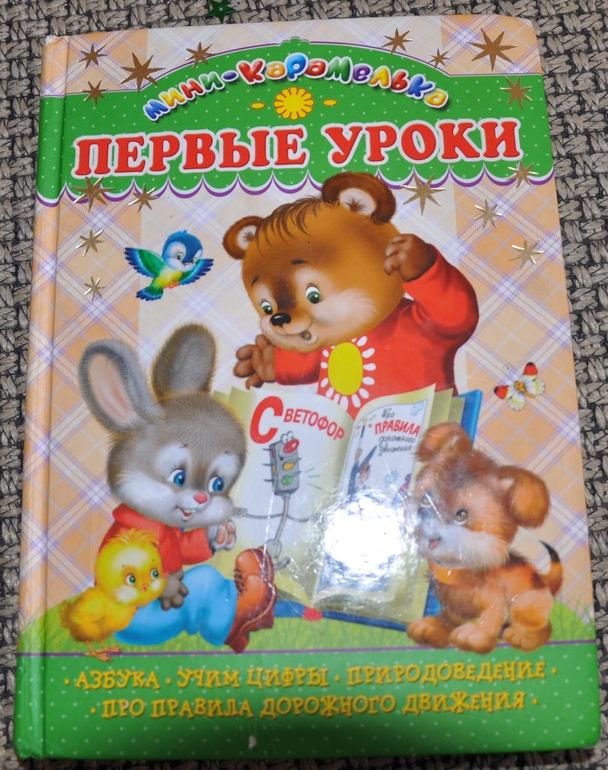 "Первые уроки" - здесь стихи разных авторов, есть азбука, и цифры. Соня ее приносит почитать ради "Правил дорожного движения" и "Сказки о жадном Вартане".