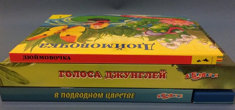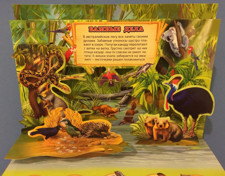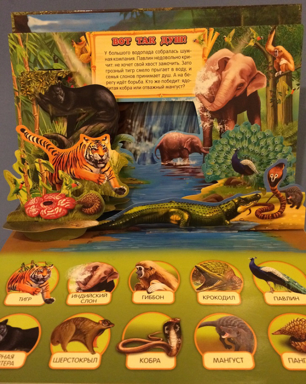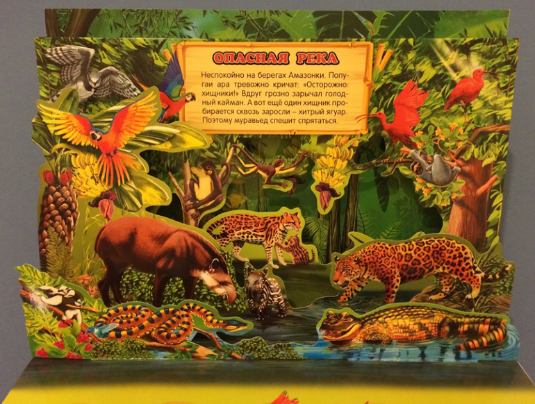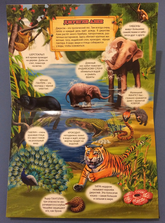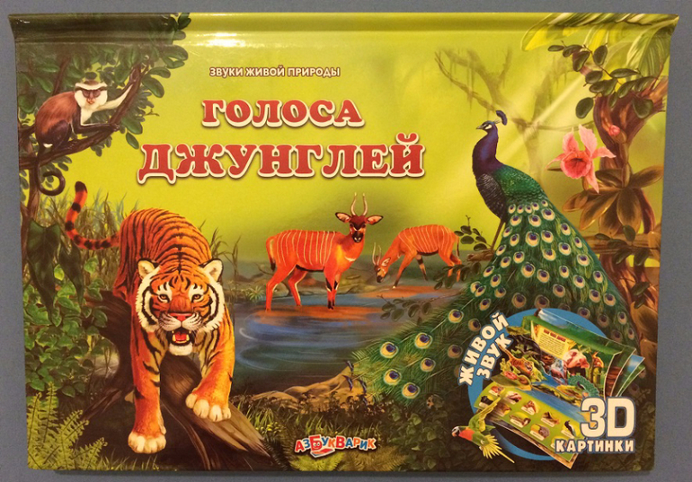 Голоса Джунглей - здесь животные кричат наперебой, но получается весьма приятное сочетание звуков. Толстый плотный картон. Всего 4 панорамки, но есть еще 4 разворота - это информация о животных.