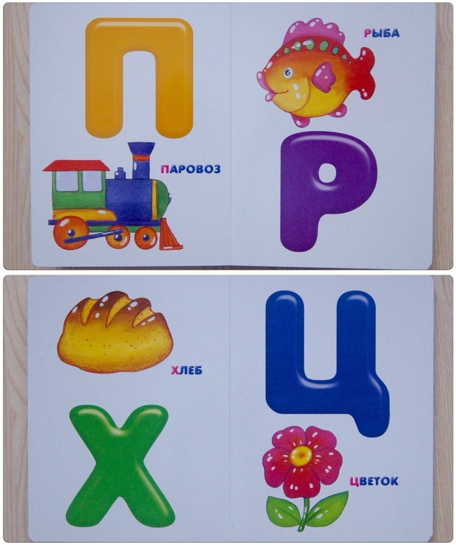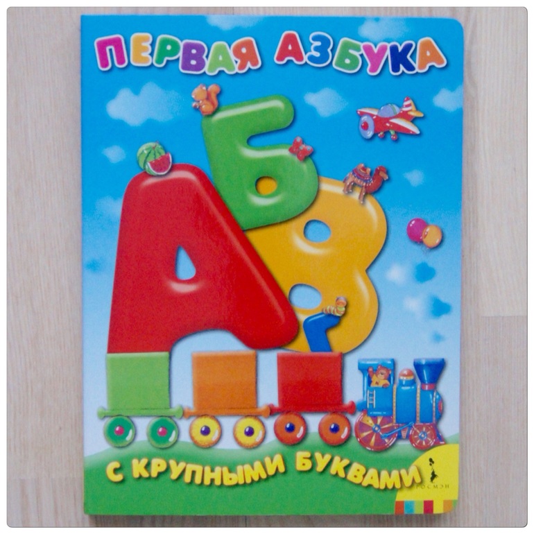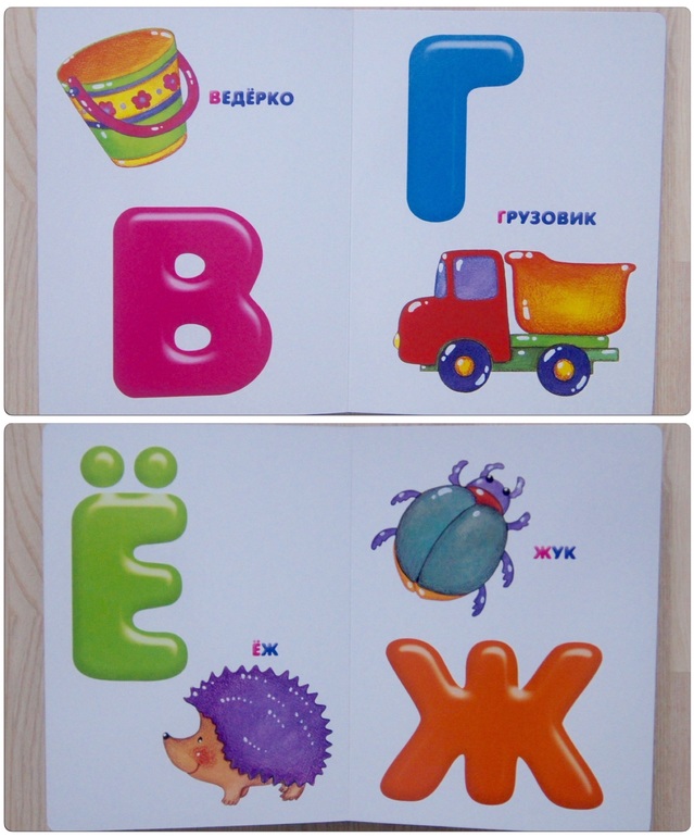Первая азбука с крупными буквами действительно оправдывает свое звание первой! Удобный формат, размером чуть менее А4, страницы из плотного картона, хорошее качество печати. Задумка этой азбуки такова, что на каждой странице располагается буква и предмет, название которого начинается с данной буквы. И вот здесь хочется отметить два минуса, которые появились непосредственно в процессе изучения книги. Во-первых, к концу азбуки издатели решили немного уплотниться, и буквы Ш-Щ, Ъ-Ы, Ь-Э, Ю-Я располагаются на странице парами, и это конечно же выбивается из общего замысла. Ну а во-вторых, мне сложно объяснить ребенку, что буква "И" - это Игрушки, так как он пытливо выясняет название каждого отдельного предмета в числе изображенных игрушек, названия которых, понятное дело, начинаются уже с других букв.