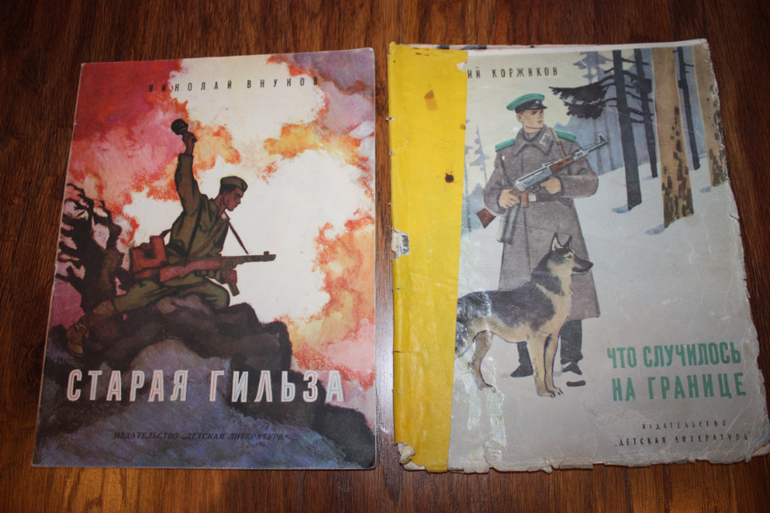 "Семь героев" Ильи Туричина с самодельной картонной обложкой (родная, видимо, приказала долго жить...)"Что случилось на границе" Виталия Коржикова тоже с сильно пострадавшей обложкой, но родной.