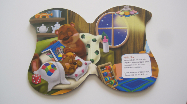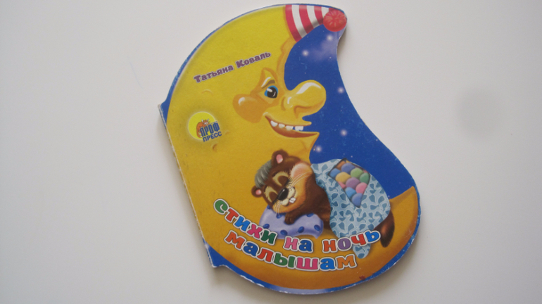 Еще одна книжка, доставшаяся нам от бабушки - Стихи на ночь малышам Татьяны Коваль. Простецкая книжка-картонка в виде месяца. Стихи - ооооочень трогательные и милые, картинки тоже трогательные. Мне нравится очень, а вот Артуру почему-то нет... Мне кажется, все дело в направленности стихов. Он вообще почему-то не любит слушать что-то перед сном, про то, как ложатся спать, колыбельные не любит. В общем, у него здесь пунктик:-) А тем детям, у кого с этим все нормально очень рекомендую, если увидите где-то